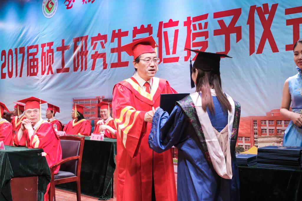 司晓宏发表了热情洋溢的讲话。他代表学校党政和广大教师向圆满完成学业的2017届硕士研究生表示热烈祝贺。他说,研究生是毕业生中的佼佼者,获得硕士学位应感到骄傲、自豪。2017届硕士研究生素质比较高,学校对你们在校期间的表现很满意。特别是92名同学中有10名同学考取了博士研究生,这充分反映我们首届研究生的培养质量。同时,他对毕业研究生提出了殷切希望:一是希望同学们永葆积极上进的心态,无论身处何时何地都要以积极向上的心态来面对自己所处的环境与遭遇,并将这种积极向上的心态付诸于脚踏实地、埋头苦干的实际行动,只要肯付出辛勤的劳作与汗水,就必将浇灌理想之花盛开;二是希望同学们永葆自信坚韧的品质。不论身处顺境还是逆境,都应保持一个坚韧自信的态度,要理性地、自信地、坚强地面对自己所处的各种社会环境、所遇到各种社会问题,继而增添前行的动力;三是希望同学们永远不要放弃品德、道德上修为。道德的发展、人品的修为永无止境。最后,他祝福同学们在广阔的社会舞台上,上演缤纷绚烂、波澜壮阔的人生;祝福同学们成为祖国的栋梁、母校的骄傲。