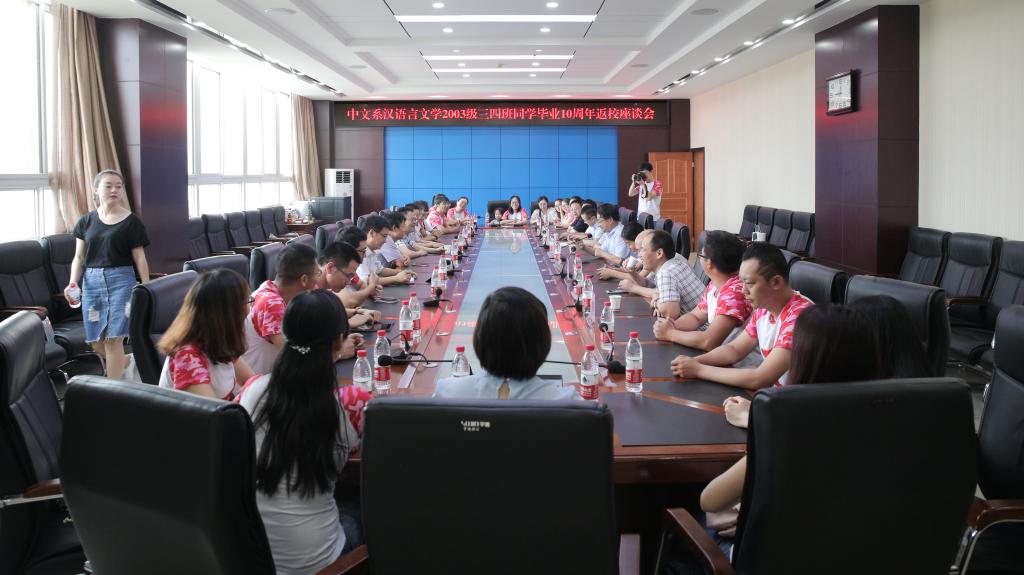 7月9日上午,原中文系2003级汉语言文学专业本科3、4班校友毕业十年返校座谈会在图书馆801会议室举行。校党委副书记栾宏出席会议。创大办、党政办领导以及当年原中文系领导、班主任、专业课教师,文学与新闻传播学院现任领导等40余人参加了座谈会。
