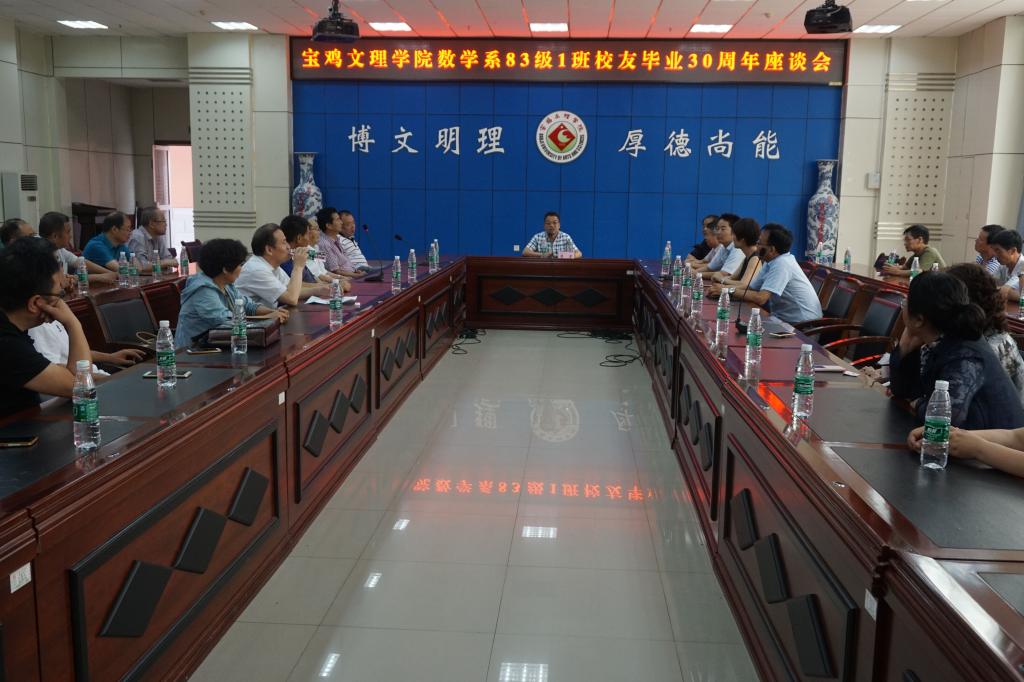 八七届本科一班校友向学校敬赠了牌匾,祝愿学校“桃李满天下,明天更美好”。创大办主任赵智劳代表学校校友总会为校友赠送了宣传纪念品。与会师生亲切座谈,共叙师生情同窗谊,共话文理发展新篇章。原任课教师强晓艺用一组七律诗向校友表达了从当年意气风发的少年到如今成熟稳健的中年的岁月沧桑,永远不变的是浓浓的师生情谊和同学友情。八七届一班班长杨百强,学生代表天津工业大学博士生导师亢保元、杭州长江汽车销售有限公司董事长梁建斌分别致感谢辞,深情回顾大学生活,畅谈自身发展现状,感恩老师的谆谆教诲,感谢母校的无私培养;八七届一班学生宝鸡市司法局政治部主任王玉祥代表校友以“高兴、感动、感恩、自豪、祝福”为题做总结发言,他说:“我们已毕业30年,大家在各个方面、在各自的工作岗位上都取得了可喜成绩。成绩的取得,得益于母校严谨的校风、学风,得益于老师们当年辛勤的培养、教导。我们要真诚地感谢母校和曾经给我们带过课、当过班主任的各位老师。师恩难忘,我们永远不能忘记!从上大学到毕业30年来,我一直住在母校文理学院,亲眼目睹了学校新老校区天翻地覆地的变化和改革发展所取得的成就,令我们很是振奋!近期学校又要在蟠龙新区开辟新校区,正在全面进行本科教学工作审核评估,努力实现创建宝鸡大学的目标,作为校友和家属我感到由衷地自豪!学校的发展和变化牵动着每一位校友的心。在此,祝愿母校明天更美好,早日实现宝大梦!”