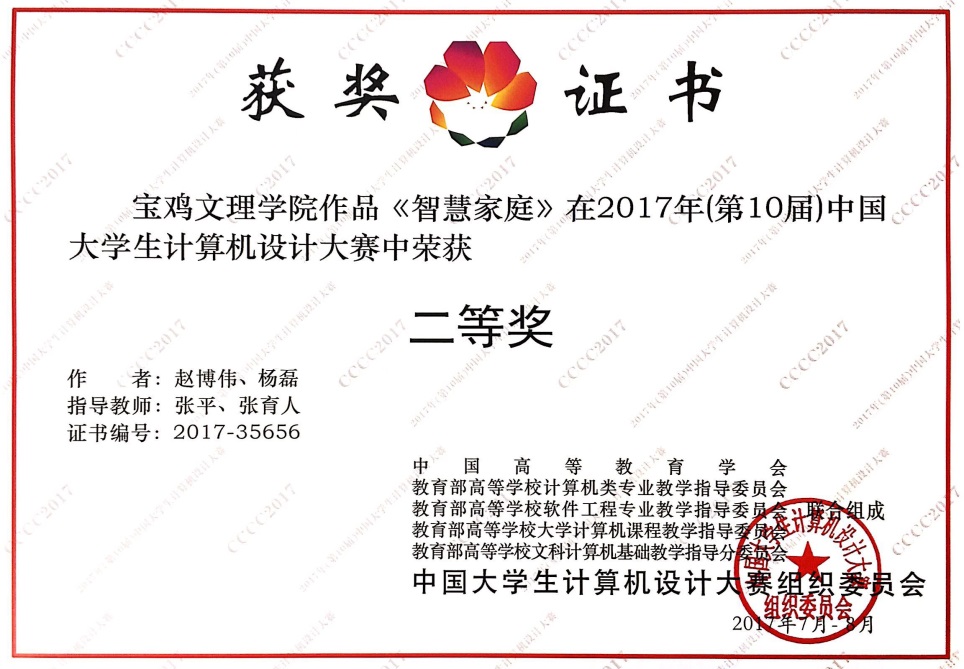 8月21日至25日,由教育部高等学校计算机类教学指导委员会、软件工程教学指导委员会、大学计算机课程教学指导委员会、文科计算机基础教学指导分委会和中国高等教育学会联合主办的2017年第十届中国大学生计算机设计大赛全国总决赛在杭州电子科技大学落下帷幕。由beat365官网计算机学院张平和张育人老师指导,计算机学院赵博伟、杨磊设计的“智慧家庭”作品经过与入围总决赛140余支队伍的激烈角逐,最终夺得全国总决赛二等奖。