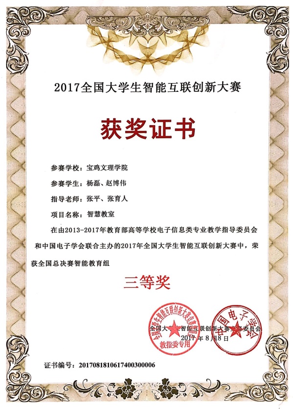8月15日至19日,由教育部高等学校电子信息类教学指导委员会和中国电子学会联合主办的2017年全国大学生智能互联创新大赛全国总决赛在重庆邮电大学落下帷幕。经过线上预赛,分赛区决赛等环节,由beat365官网计算机学院张平和张育人老师指导、计算机学院赵博伟、贺伟伟、薛斌设计的“基于残障儿童的家庭监护系统”作品荣获华西赛区二等奖。由张平和张育人老师指导,计算机学院杨磊、赵博伟、韩重津设计的“智慧教室”作品经过与华西、华中、华南、华北四个赛区近千支队伍的激烈角逐,最终以华西赛区一等奖的好成绩入围全国总决赛,并夺得全国总决赛三等奖的佳绩。