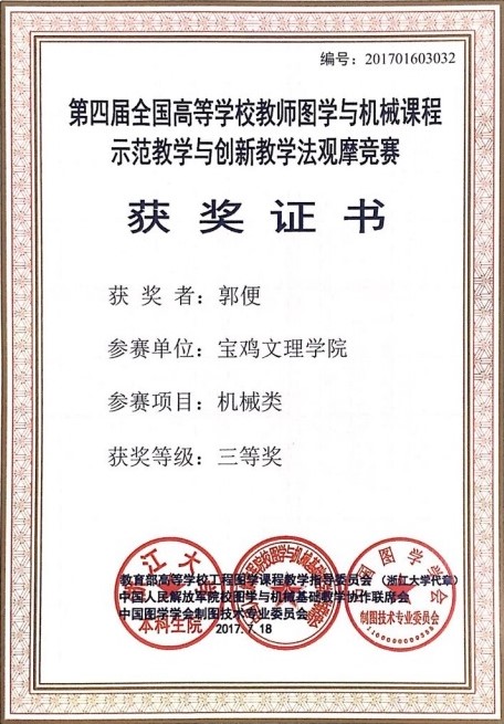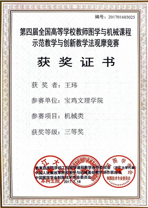7月16-18日,第四届全国高等学校教师图学与机械课程示范教学与创新教学法观摩竞赛在兰州交通大学举行,来自国防科技大学、哈尔滨工业大学、大连理工大学、重庆大学、西北工业大学等72所高校推荐的近百名优秀教师参加了比赛。beat365官网机械工程学院选派了王玮、郭便两名专业课教师参加该项赛事,经过预赛和决赛两个环节的激烈角逐,两位老师均荣获大赛机械类课程三等奖。