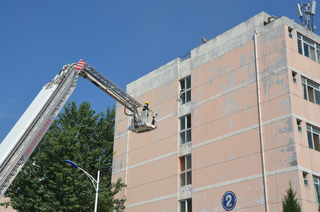 应急疏散逃生演练分为火灾报警、现场警戒、灭火处置、组织疏散、水带灭火、消防云梯救人、现场救护等环节。下午14:00,在一阵急促的警报声中“消防应急疏散演习”活动的序幕拉开了。2号学生公寓四楼浓烟滚滚,参加演习的学生在宿舍管理人员的引导下用湿毛巾捂住口、鼻,保持弯腰姿势从事故现场按楼层经过安全通道有序撤离。六楼一名被困学生被消防车曲臂登高平台顺利营救,火灾也在消防人员的组织下被扑灭。整个演练秩序井然,全体师生态度认真,动作迅速。