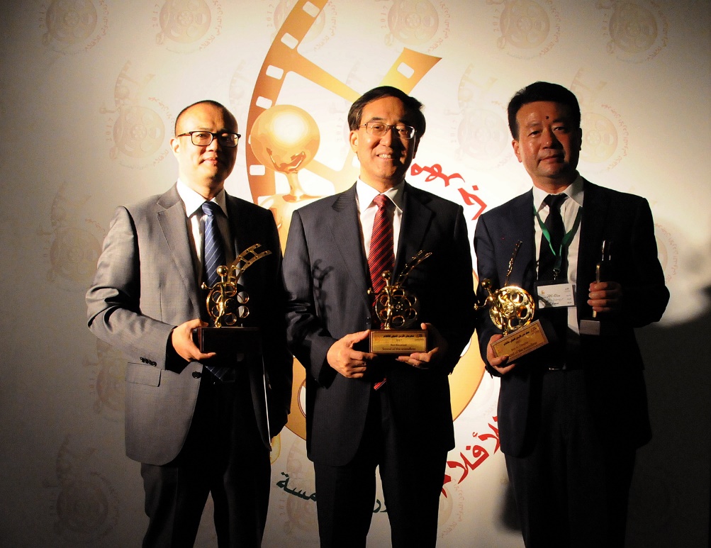 | 何钦先生(右一)和中国驻约旦大使潘伟芳先生、文化参赞杨荣浩先生在电影节闭幕式上 |