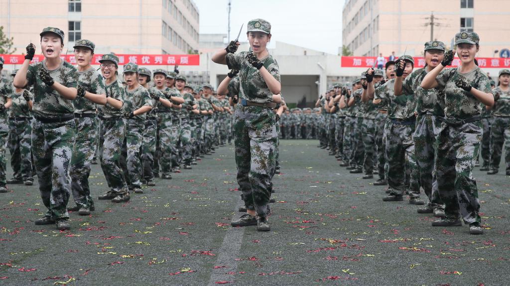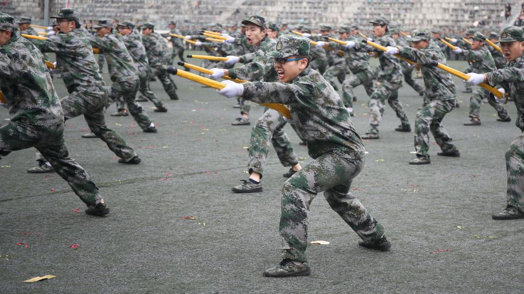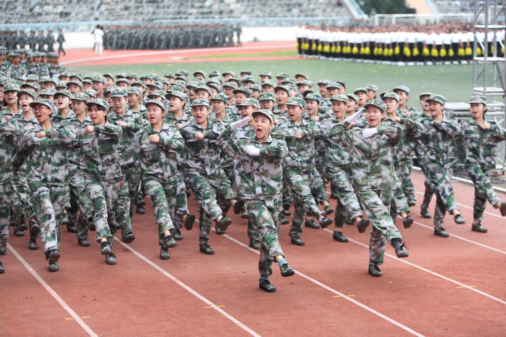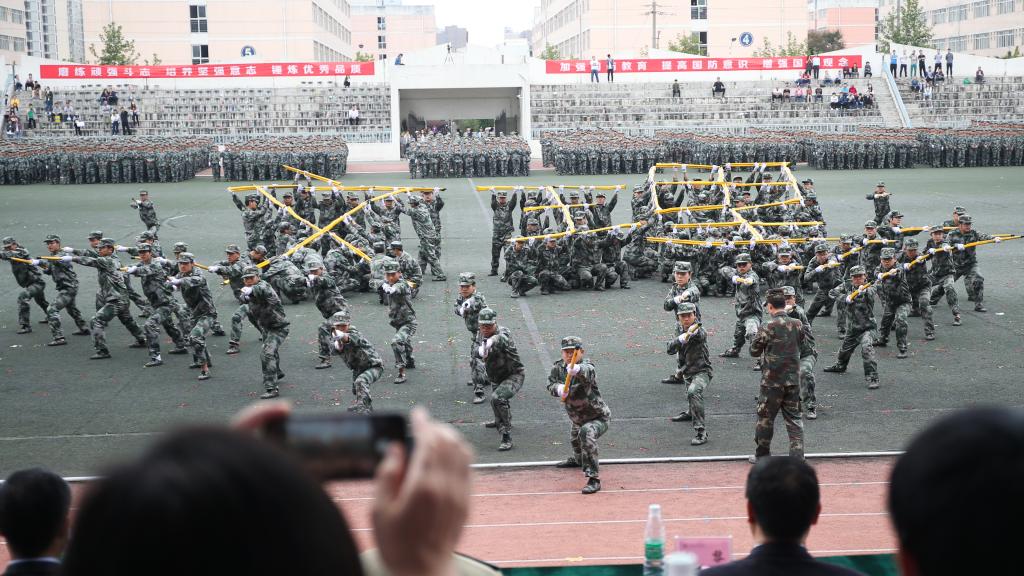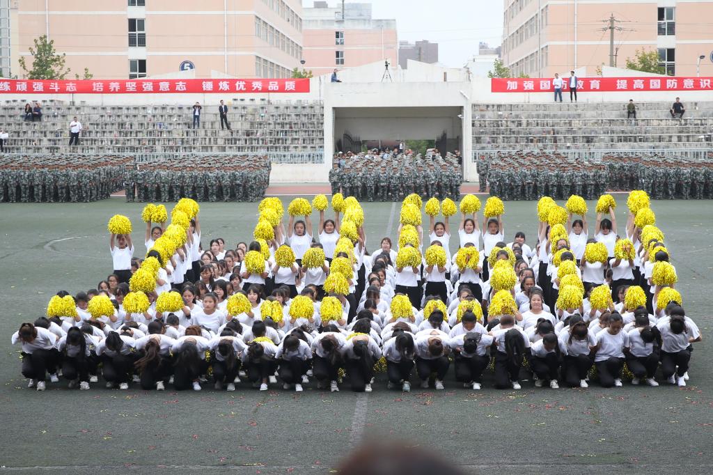 随后,参训学生进行了军事课目汇报表演,全面展示了15天来的训练成果。女子啦啦操方阵以舞蹈的形式演绎了军营生活的丰富多彩,刚柔并济、跌宕起伏,展示了文理学子的青春风采;女子匕首操展现了巾帼不让须眉的豪情气概;500名男同学组成的擒敌格斗表演,刚劲有力,喊声震天,展示了革命先辈们在硝烟滚滚的战场上遇敌亮剑,剑锋所指,所向披靡的英雄豪情;军体拳表演展示了拳打、脚踢、摔打、夺刀等系列内容,动作整齐、沉着有力,展现了文理学子的飒爽风姿和阳刚之气。每一个表演科目都用整齐划一的“1958”“2020”展示了文理学子的家国情怀,向军训生活交上了一份完美的答卷。