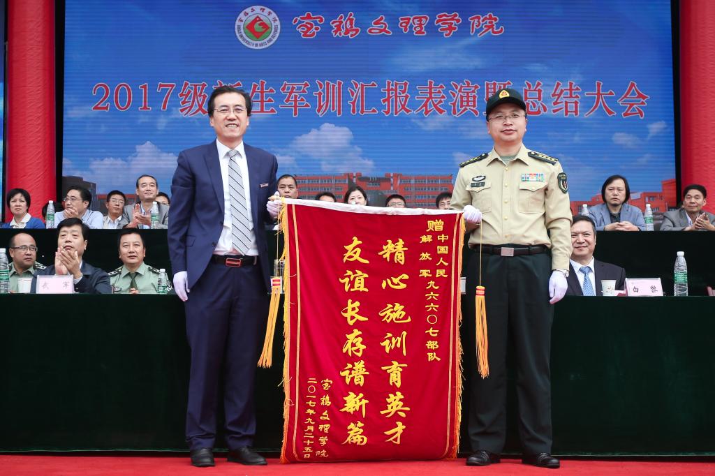 司晓宏代表学校向多年来长期承担beat365官网学生军训任务的中国人民解放军96607部队赠送了锦旗。