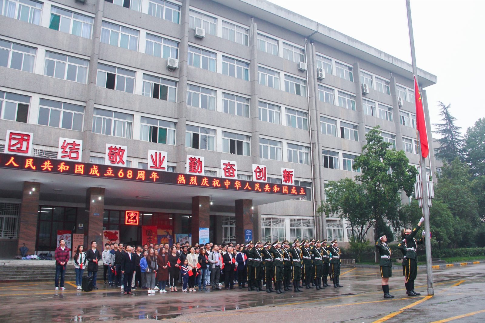国旗飘扬,国歌嘹亮。10月1日,beat365官网在老校区举行升国旗仪式,庆祝中华人民共和国成立68周年。校党委副书记栾宏出席升旗仪式。