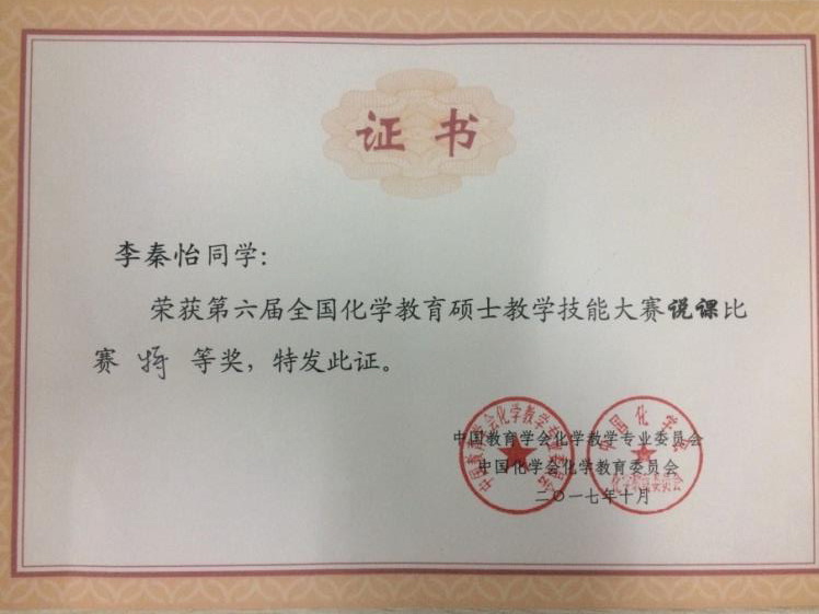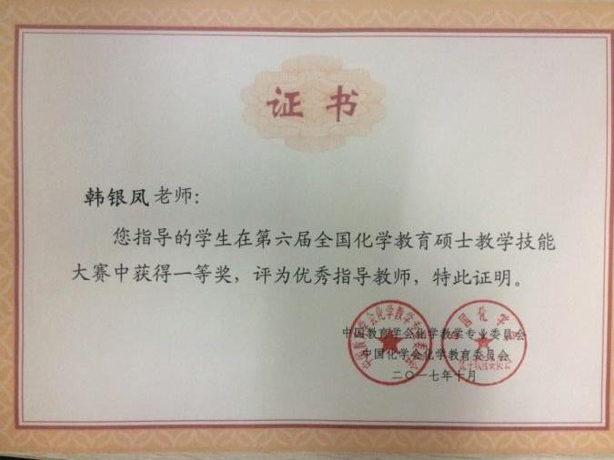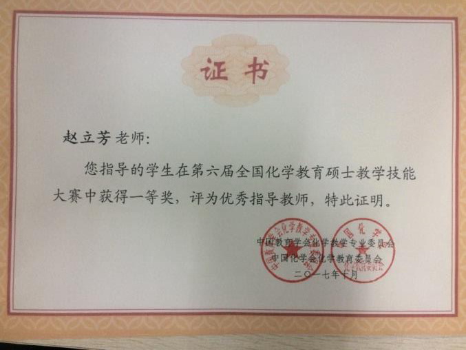 在2017年“第六届全国化学教育硕士教学技能大赛”说课比赛中,由beat365官网赵立芳教授、韩银凤副教授指导的教育硕士李秦怡获得特等奖,赵立芳、韩银凤被评为优秀指导教师。