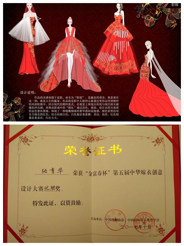 10月19日,在杭州国际博览中心举行的“金富春杯”第五届中华嫁衣创意设计大赛入围作品现场颁奖典礼上,美术学院2014级服装设计专业学生张育华的作品“影嫁”获得大赛优胜奖。