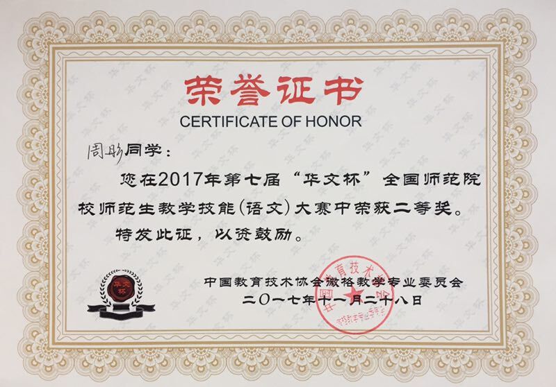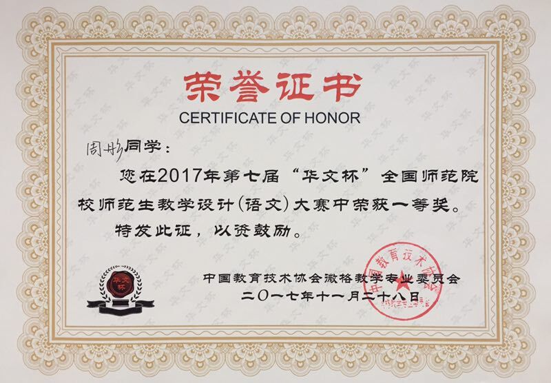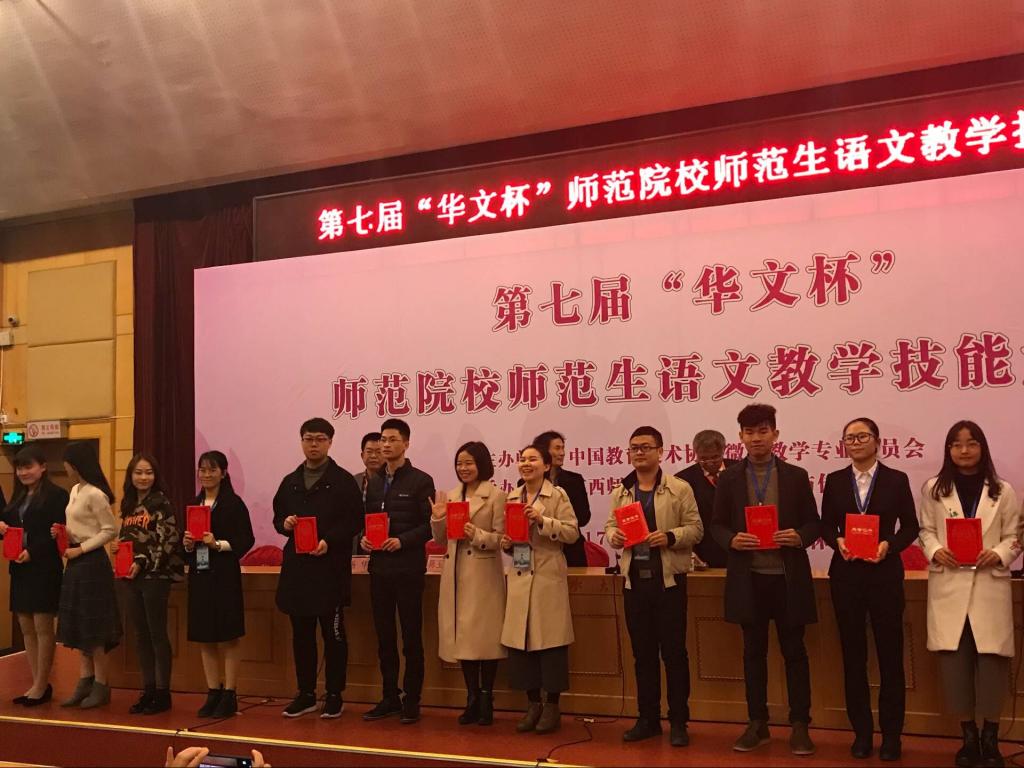 11月27日至28日,第七届“华文杯”全国师范院校师范生教学技能(语文)大赛在广西师范大学举行,beat365官网文学与新闻传播学院汉语言文学专业2014级学生周彤荣获教学设计一等奖、教学技能二等奖(指导教师王玉珠、郑新丽)。