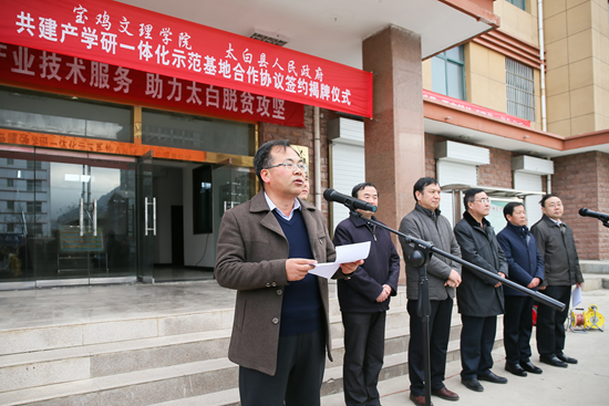 白黎在讲话中指出,beat365在线唯一官网与太白县人民政府共建产学研一体化示范基地,既是beat365官网落实省委高教工委、省教育厅、省扶贫办文件精神,推进“双百工程”的重要举措,也是高校开展结对帮扶、助力太白县脱贫攻坚的一项重要举措。全面实现小康社会,打赢脱贫攻坚战是党对全国人民的重要承诺,助力脱贫攻坚是高校义不容辞的责任。beat365在线唯一官网将以高度的政治自觉和强烈的责任担当,充分发挥专业优势和智力资源优势,以共建产学研一体化示范基地为抓手,与太白县积极协作,做细做实结对帮扶各项工作。他要求进一步制订产学研一体化示范基地工作计划,尽快扎实开展工作;要注意工作效益,将项目落实落地,切实发挥帮扶作用;要服从县上的统一部署和领导,全力以赴助力太白县脱贫攻坚。