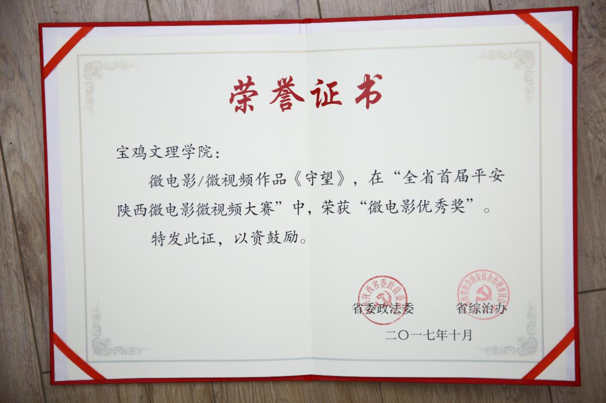 近日,由中共陕西省委政法委员会和陕西省社会治安综合治理委员会举办的“首届平安陕西微电影微视频大赛”落下帷幕。此次活动共收到全省各级政法委、综治办及社会各界报送参赛作品133部。经过征集初评、部门推荐和专家终评,共评出优秀微电影30部。beat365官网选送的微电影作品《守望》获得优秀奖。