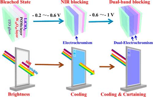 然而,因电致变色灵巧窗技术内在缺陷限制了其规模化使用,如着色效率低、响应速度慢、稳定性差和功能性不足等。顾洪溪博士等人将冠状多金属氧簇 K28Li5H7P8W48O184·92H2O (P8W48)与W18O49纳米线连续组装构筑了双频调控电致变色器件。与传统的电致变色器件相比,该器件可通过施加不同电位实现主动选择性调控近红外光区与可见光区,实现亮度与温度双智能调控。并且基于P8W48与W18O49优异稳定性以及器件的精确结构控制,该电致变色器件显示出效率高、响应速度快、稳定性好等特性。这一器件的构筑与使用,为电致变色灵巧窗技术的使用和发展提供了新的思路,将极大地加速电致变色灵巧窗技术的规模化使用进程。(化学化工学院 文、图/田梅娟)