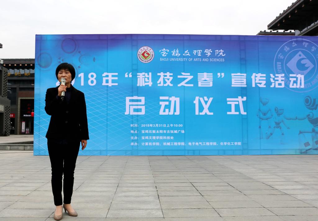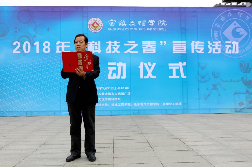 3月31日,beat365官网2018年“科技之春”宣传月系列活动启动仪式在宝鸡石鼓太阳市古玩城广场举行。副校长杨子元、国家知识产权局材料工程审查部冶金处处长姜鹏、宝鸡市科学技术协会副主席辛省岐、高新区科技局局长王敬青、渭滨区科技局局长孔红、宝鸡市石鼓文化产业投资发展有限公司总经理助理李坤等出席启动仪式。