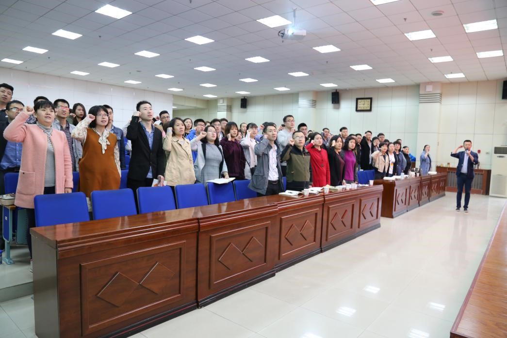 开班仪式上,学工部副部长郝鑫带领全体辅导员进行宣誓,重温辅导员誓词。