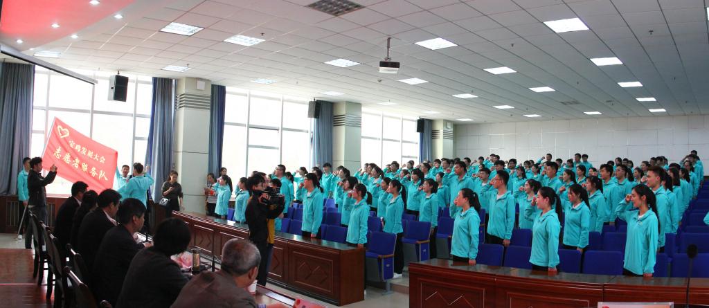 团市委书记魏莉介绍了志愿者招募培训情况;教务处处长李景宜为志愿者代表佩戴校徽;校团委书记党建波为志愿者授旗;全体志愿者集体进行了宣誓活动。