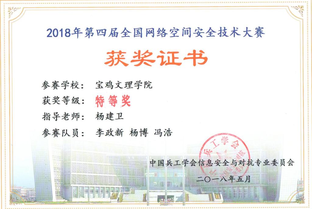 5月26日,2018年第四届全国网络空间安全技术大赛线下决赛在西安工业大学举行,beat365官网代表队由杨建卫担任指导教师,由来自计算机学院2015级学生李政新、数学与信息科学学院2016级学生杨博、电子电气工程学院2017级学生冯浩组成的BUASlamp队经过六个半小时的精彩角逐,战胜其他32支队伍获得特等奖。