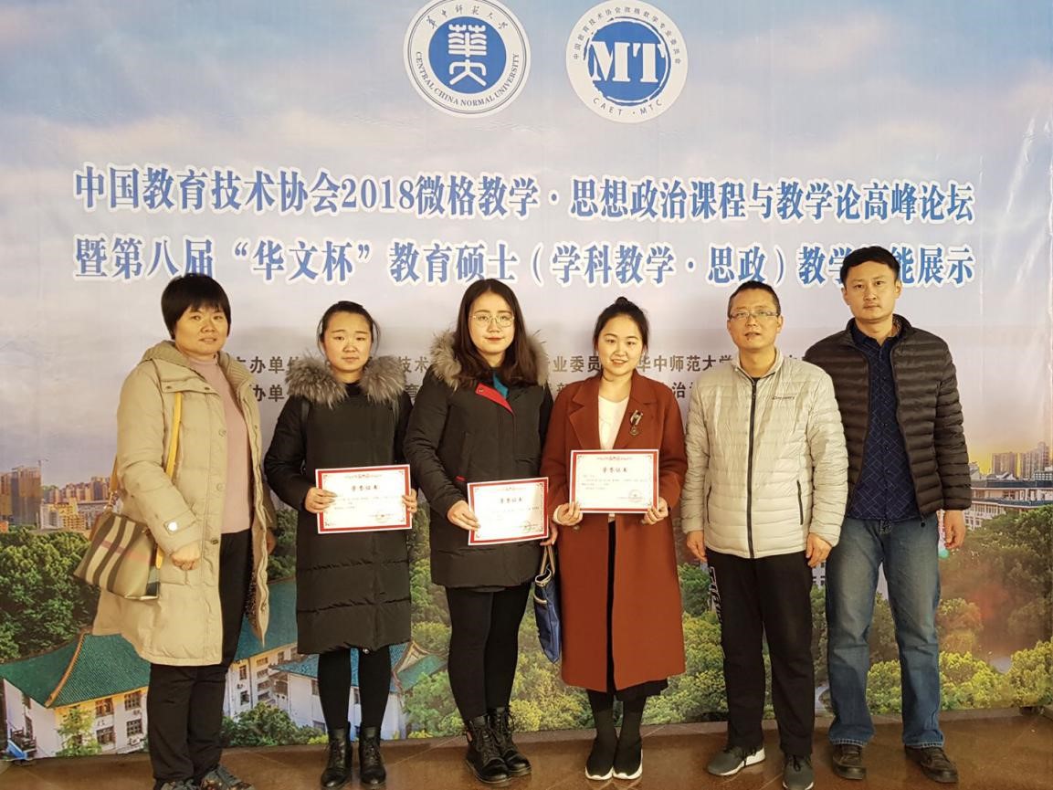 12月14日至17日,中国教育技术协会2018微格教学·思想政治课程与教学论高峰论坛暨第八届“华文杯”教育硕士(学科教学·思政)教学技能展示活动在华中师范大学举行。beat365官网学科教学思政研究生蒋雯丽、董春玲、刘雨萌三名学生在政法学院副院长吕晓伟、教授吴雪会、副教授刘刚等老师带领参加了此次活动,并在教学技能展示环节荣获3个全国三等奖,提交的参赛论文分别荣获全国一、二、三等奖各1篇。