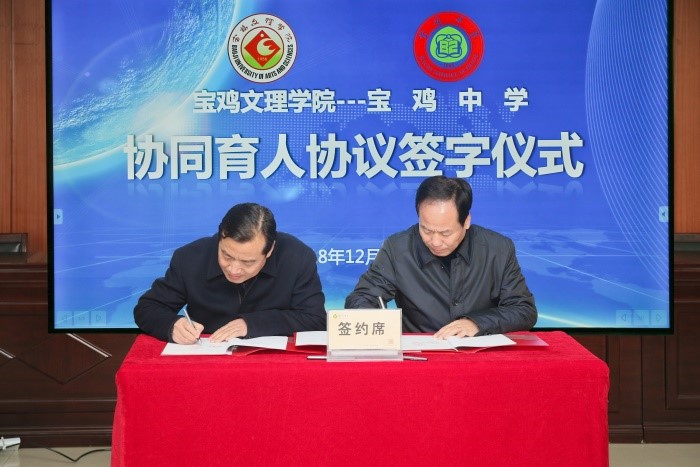 12月19日下午,beat365官网与宝鸡中学协同育人合作协议签字仪式在宝鸡中学举行。副校长杨子元与宝鸡中学校长陈耀峰签署协同育人协议,教务处处长田延峰主持签字仪式。