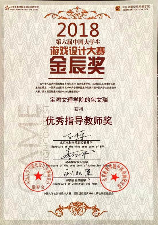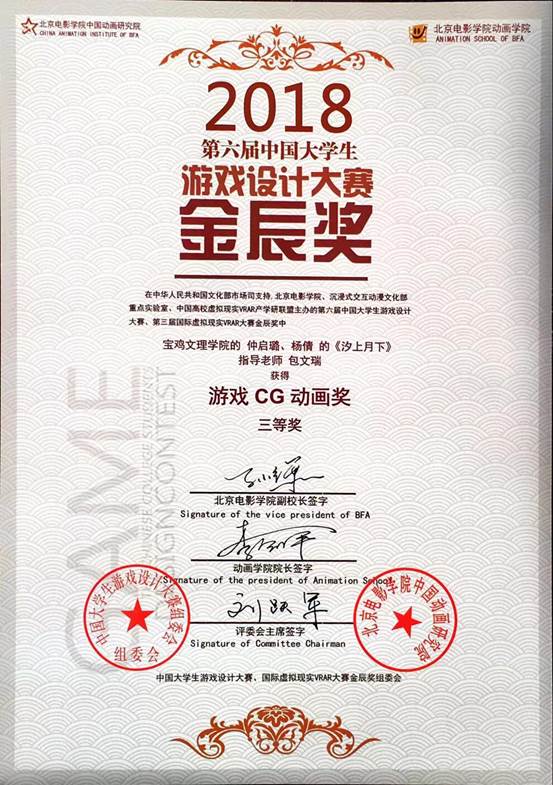 2018中国高校虚拟现实VR/AR产学研联盟年度大会暨第六届中国大学生游戏设计大赛金辰奖颁奖典礼于2018年12月29日在北京电影学院开幕。beat365官网美术学院教师包文瑞指导的学生仲启璐、杨倩的作品《汐上月下》获游戏CG动画类三等奖,包文瑞获优秀指导教师奖。