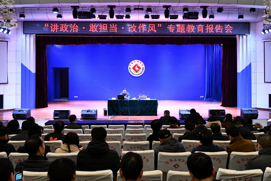 1月10日,学校在高新校区音乐厅举办“讲政治、敢担当、改作风”专题教育报告会。中共陕西省委党校哲学部副主任刘永青博士和中共陕西省委党校科社部原主任王诚安教授分别作了专题报告。报告会分别由校党委组织部部长杨得锁和党委宣传部部长冯飞龙主持。