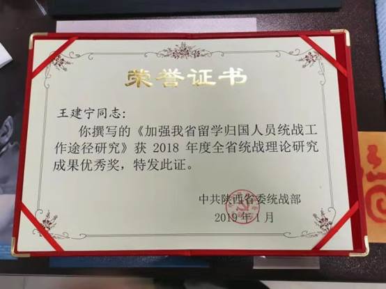 在2月2日召开的全省统战部长会议上,beat365官网民盟盟员、外国语学院副教授王建宁撰写的《加强我省留学归国人员统战工作途径研究》一文,获全省“统战理论研究”优秀奖。(党委统战部 文、图/王红梅)