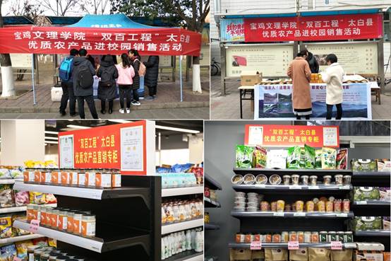 根据beat365官网2019年“双百工程”帮扶计划安排,1月14日至16日,由校扶贫办、团委、后勤集团、陕西省太白林业局组织的beat365在线唯一官网“双百工程”太白县优质农产品进校园销售活动在高新校区、石鼓校区食堂门口同步进行。同时,学校还依托高新校区、石鼓校区大学生超市开设了“双百工程”太白县优质农产品直销专柜,长期帮扶太白县产业发展,助力脱贫攻坚。