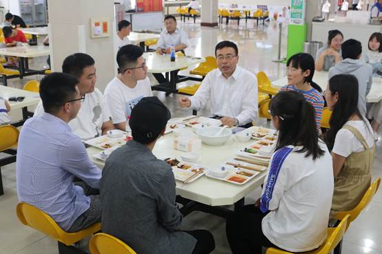 5月23日中午,“我与书记校长面对面”活动如约而至,校长郭霄鹏来到高新校区学生餐厅,与7名学生代表共进午餐,亲切交流互动,了解他们的学习、生活情况,听取他们对学校工作的意见和建议,午餐会成为师生敞开心扉的一次“家常谈心”。