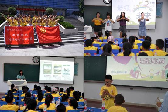 下午,小学生们来到留守儿童关爱与发展研究中心,教育学院师生为小学生们表演了手语操,进行了手语教学,开展了你划我猜的互动游戏,分享了“时代楷模”故事,组织开展了“我心中的大学”留言活动。