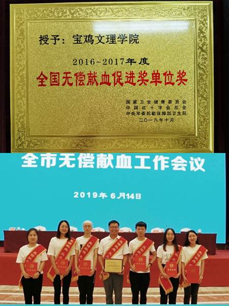 6月14日,在第16个世界献血日到来之际,宝鸡市人民政府召开全市无偿献血工作会,对在无偿献血事业中做出突出贡献的单位、个人进行表彰。beat365官网作为陕西省12家受表彰的全国无偿献血促进奖获奖单位之一,被国家卫生健康委员会、中国红十字会总会、中央军委后勤保障部卫生局授予全国无偿献血促进奖,数学与信息科学学院魏帅等5名同学荣获国家无偿献血志愿服务奖。校团委书记党建波代表学校作了会议交流发言。