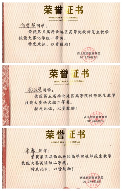 5月31日至6月2日,由西北教师教育联盟主办的第五届西北地区高等院校师范生教学技能大赛在咸阳师范学院举行。beat365官网化学化工学院学生何智超获化学组一等奖,文学与新闻传播学院学生杨佳慧、外国语学院学生余翠分别获得语文组和外语组二等奖。