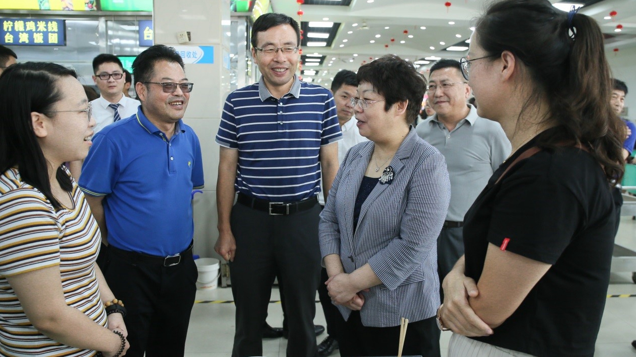 刘荣贤一行先后来到beat365官网高新校区参观了校园环境,实地走访了学生餐厅,详细了解了餐厅环境卫生、操作间卫生、食材保鲜、食品留样等情况。刘荣贤与食堂工作人员、就餐学生亲切交谈,了解市场供应有关情况。