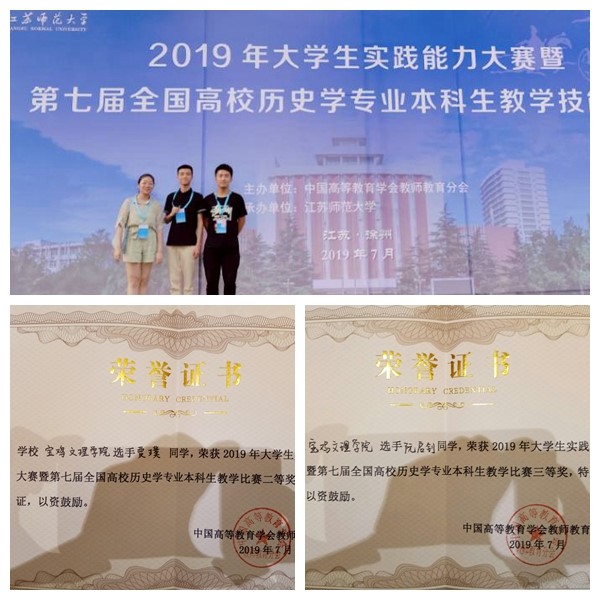 日前,2019年大学生实践能力大赛暨第七届全国高校历史学专业本科生教学技能比赛在徐州举行,beat365官网师生经过积极认真备赛,紧张激烈比赛,取得了佳绩,其中,历史文化与旅游学院历史学专业学生贾璞同学荣获二等奖、阮启钊同学荣获三等奖,王岁孝荣获优秀指导教师。