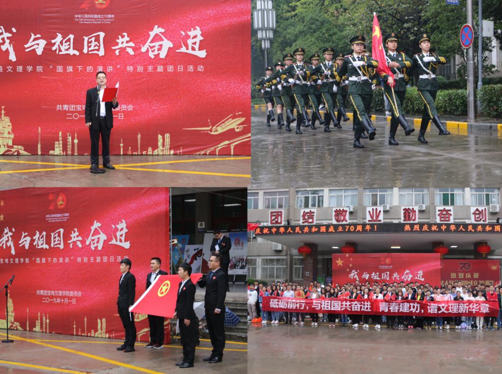 一面鲜艳的红旗、一首激昂的国歌、一堂生动的主题团课、一段坚定的誓词,激发了文理学子的爱国情怀和奋斗决心。“我与祖国共奋进——国旗下的演讲”主题团日活动是学校共青团开展庆祝中华人民共和国成立70周年主题宣传教育实践活动之一,通过“沉浸式”的仪式教育,激励和引导全校广大团员青年更加紧密地团结在以习近平同志为核心的党中央周围,大力弘扬以爱国主义为核心的伟大民族精神,不忘初心,牢记使命,为实现中华民族伟大复兴而不懈奋斗,为早日建成高水平宝鸡大学贡献青春力量。