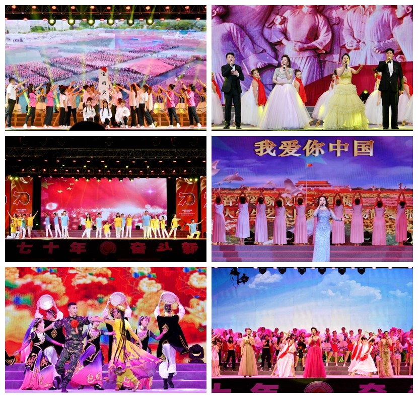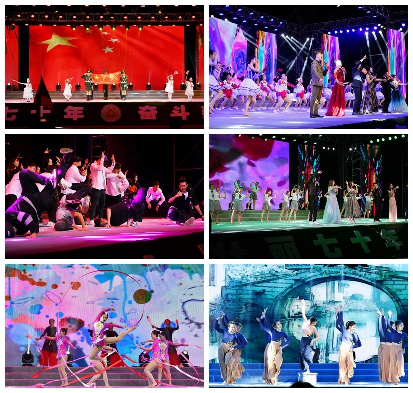 晚会分为“青春万岁”“祖国万岁”两个篇章。《点赞新时代》拉开了晚会的序幕,文理人为新中国成立70年来的光辉历程点赞,为新时代祖国取得的伟大奇迹点赞;体育舞蹈《跃动》、街舞《最好的舞台》、歌曲联唱《梦想开始的地方》用动感的舞姿和音符演绎着文理学子的蓬勃活力和青春气息;舞蹈《踮步桥水清悠悠》唤起了故乡的记忆,让在场师生经历了家园情怀和精神归属的洗礼;音乐情景剧《薪火相传文理情》、歌伴舞《不忘初心》全景式回顾了宝文理61年走过的不平凡发展历程,表现了老一辈文理人可歌可泣的青春之歌和文理学子“感党恩、听党话、跟党走”的精神面貌,展现了文理人“忠诚于党的教育事业”的初心和“为党育才、为国育人”的使命;舞蹈《花儿永远这样红》,歌曲《新幸福拍手歌》展示了各民族团结统一、自强不息的民族精神和对幸福生活的热爱与追求;情景诗朗诵《五星红旗,我向您敬礼》、歌曲《我爱你中国》表达了文理学子传承红色基因、感恩奋进新时代的责任担当,凸显了文理人不忘初心、牢记使命、砥砺前行的信心和决心。一首万人大合唱《我和我的祖国》将全场气氛推到最高点,师生们挥舞手中的五星红旗,共同唱出对新中国成立70周年的美好祝愿,现场汇成一片红色的海洋。