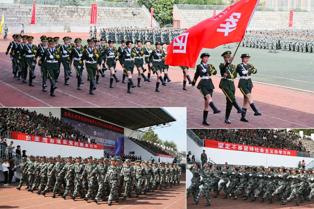伴随着激昂的《分列式进行曲》旋律,2019级4700多名学生列成多个方队,依次通过主席台,接受学校领导和部队首长的检阅。同学们队列整齐划一,步伐铿锵有力,嘹亮的口号激荡在会场上空。随后,由1000名男生带来的拳术表演刚劲有力,一招一式尽显斗志昂扬;1000人的女子军体拳表演展示了拳打、脚踢、摔打、夺刀等系列内容,一拳一脚展现出巾帼不让须眉的风采。参加汇报表演的每一位学生都以激昂的斗志,挥洒着青春的誓言,精彩的表演迎来全场师生的阵阵掌声和喝彩声。