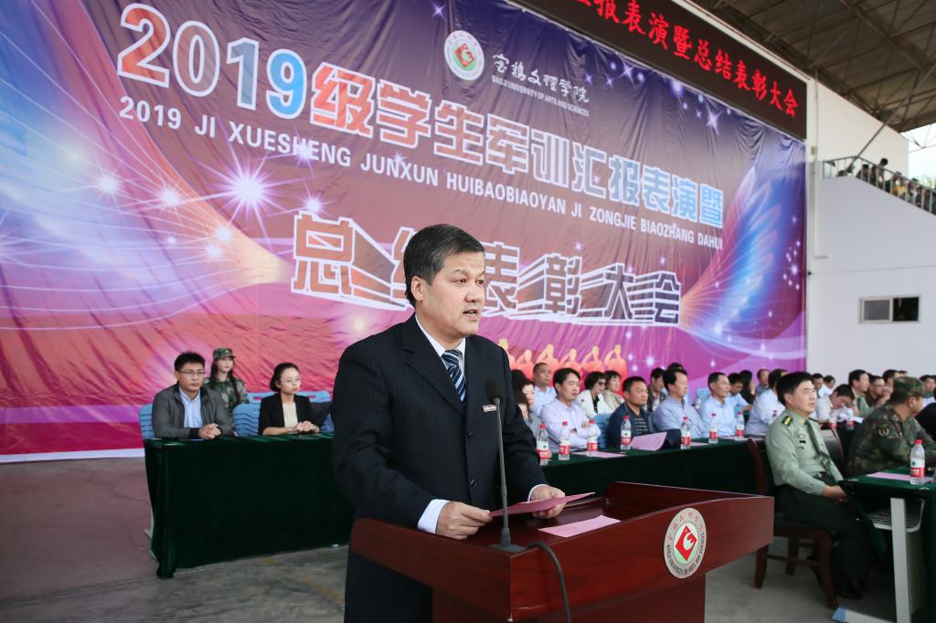 党委副书记、军训领导小组组长栾宏作了总结讲话,他向96607部队全体承训教官的辛勤付出表示衷心的感谢,向全体参训干部和同学们表示亲切的慰问,并向军训中取得优异成绩的先进集体和个人表示热烈的祝贺。他指出,军训期间,2019级新生所表现出的吃苦耐劳精神、团结协作意识充分展现了新时代青年的风采。承训教官以饱满的政治热情、良好的精神风貌、认真负责的工作态度、纪律严明的军人作风影响并感染着每一位新同学,为beat365官网的人才培养做出了重要贡献。全体学工干部与教官们密切配合,把严格的管理同深入细致的思想政治工作融为一体,为军训的圆满完成奠定了良好的基础。他同时对beat365官网今年学生军训工作的创新举措,对教学、管理、后勤等有关部门、全体参训教师在工作过程中展现出的大局意识、团结意识、奉献意识和创新意识予以了充分肯定。他希望全体新同学牢记党和人民的嘱托,继续发扬军训精神,弘扬学校优良传统,珍惜时光,勤奋学习,立德修身,立心逐梦,不断迎接人生新的征程、新的挑战。