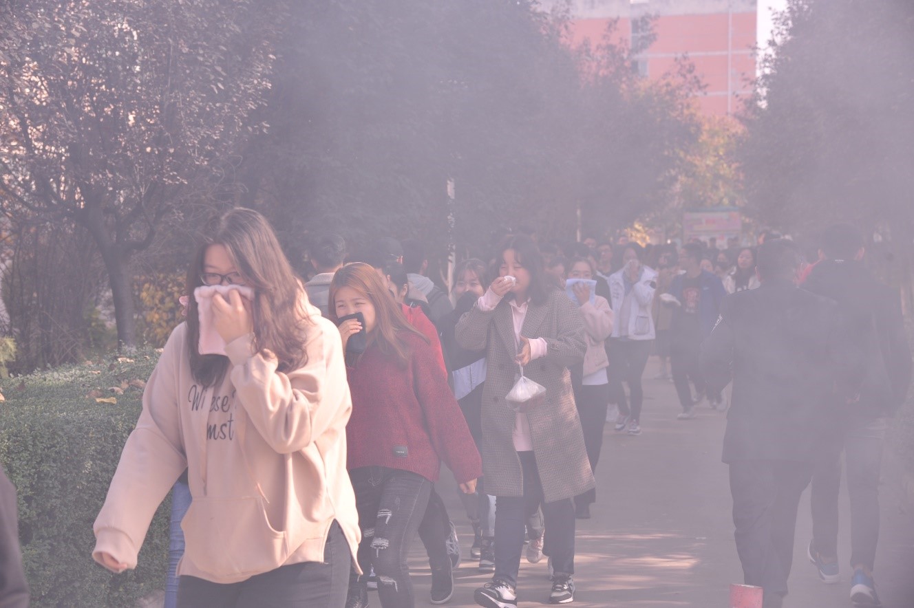 听到警报声后,参加演练的学生在宿舍管理人员的引导下用湿毛巾捂住口、鼻,保持低姿弯腰从火灾现场按楼层经过安全通道有序撤离到安全区域。