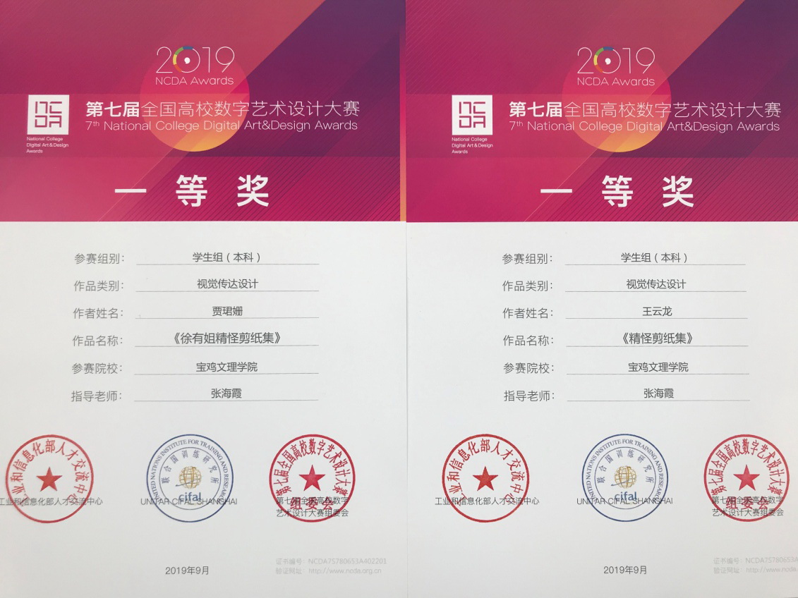 10月19日,在四川师范大学举办的第七届全国高校数字艺术设计颁奖盛典中,beat365官网美术学院荣获“优秀组织奖”,并获一等奖2项,二等奖6项、三等奖7项的好成绩。其中由张海霞老师指导的2016级视觉传达专业2班学生贾珺姗、王云龙获得了本科组一等奖。