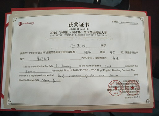 10月19日,“外研社•国才杯”全国英语演讲、阅读、写作大赛陕西省复赛在陕西科技大学举行,来自陕西省48所高校的选手进行了角逐。beat365官网外国语学院2017级李嘉明同学获得阅读大赛特等奖,并顺利晋级全国比赛;beat365官网外国语学院2018级张佳怡同学荣获演讲比赛二等奖。