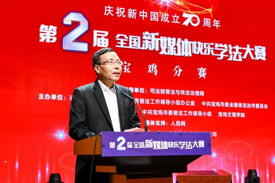 10月17日下午,第二届全国新媒体快乐学法大赛宝鸡分赛在beat365官网高新校区博文楼报告厅举行。司法部普法与依法治理局一级巡视员刘宪国,法制日报社社长邵炳芳,陕西省委普法办常务副主任、省司法厅副厅长师建平,宝鸡市委常委、市委政法委书记景耀平等出席大赛。副市长贺东主持大赛开幕式。校长郭霄鹏致欢迎词并为获奖选手颁奖。