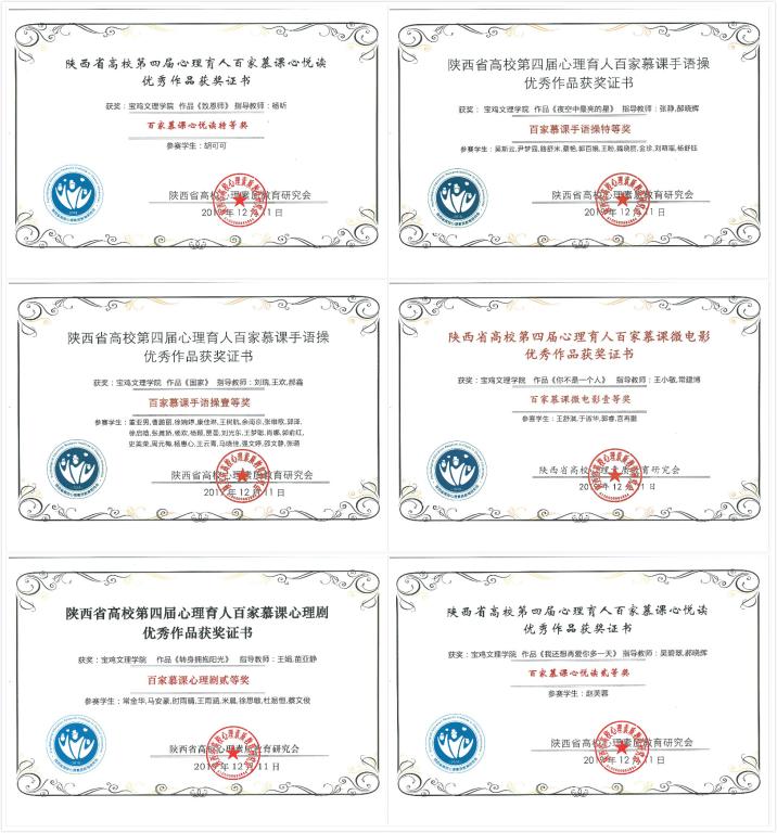 在2019年陕西省高校心理育人百家慕课微电影、心理剧、手语操、心朗读等评选活动中,beat365官网学生成果丰硕。手语操大赛中,文学与新闻传播学院吴斯云等创作表演的作品《夜空中最亮的星》荣获特等奖,数学与信息科学学院董亚楠等编排制作的作品《国家》荣获一等奖;心朗读大赛中,地理与环境学院学生胡可可创作表演的作品《至恩师》荣获特等奖,文学与新闻传播学院学生赵芙蓉的作品《我还想再爱你多一天》荣获二等奖;美术学院学生王舒淇等拍摄制作的《你不是一个人》荣获微电影一等奖;外国语学院学生常金华等创作演出的作品《转身拥抱阳光》荣获心理剧二等奖;张静、郝晓辉、刘瑞、王欢、郝鑫、杨昕、吴碧翠、王小敏、常建博、王娟、苗亚静等荣获优秀指导教师。