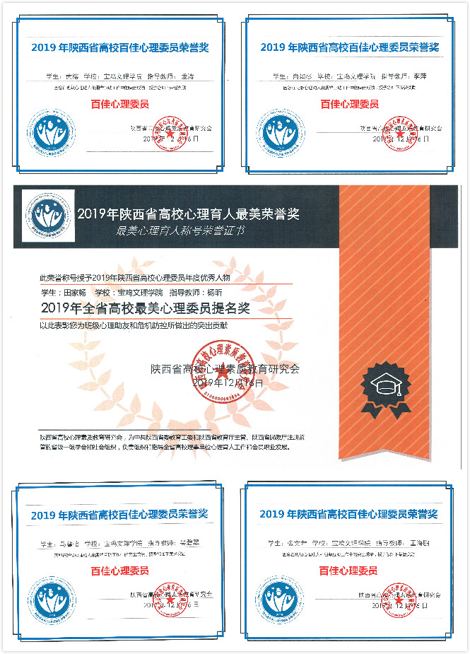 在2019年陕西省高校最美心理委员和百佳心理委员评选中,地理与环境学院田佳畅荣获2019年陕西省高校最美心理委员提名奖,经济管理学院张文萱、地理与环境学院黄榕、文学与新闻传播学院肖如彬、马馨怡荣获2019年陕西省高校百佳心理委员荣誉称号;杨昕、董海鹏、龙涛、李萍、吴碧翠等荣获优秀指导教师。