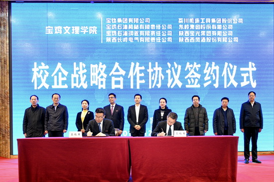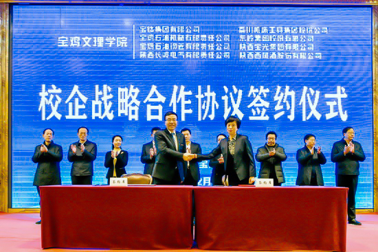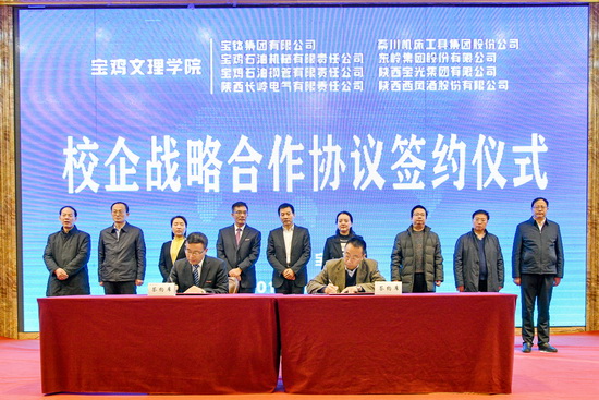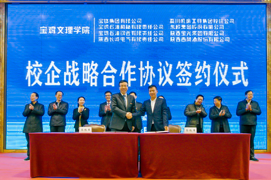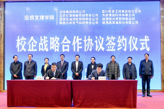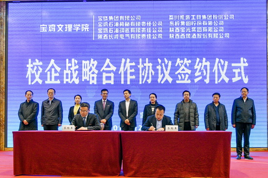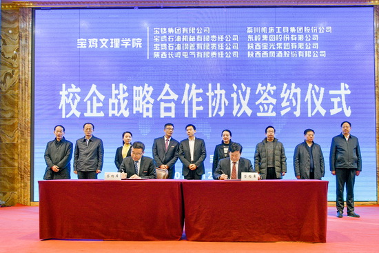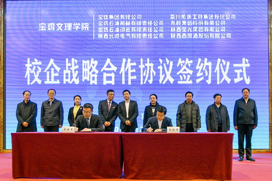 校长郭霄鹏分别与宝钛集团有限公司党委书记、董事长王文生,秦川机床工具集团股份公司副总经理杭宝军,陕西宝光集团有限公司党委书记、董事长李军望,陕西长岭电气有限责任公司党委书记、董事长李航,陕西西凤酒股份有限公司副董事长、总经理贾智勇,宝鸡石油钢管有限责任公司副总经理冯文升,宝鸡石油机械有限责任公司纪委书记梁志栋,东岭集团股份有限公司办公室主任李伟签订了战略合作协议。