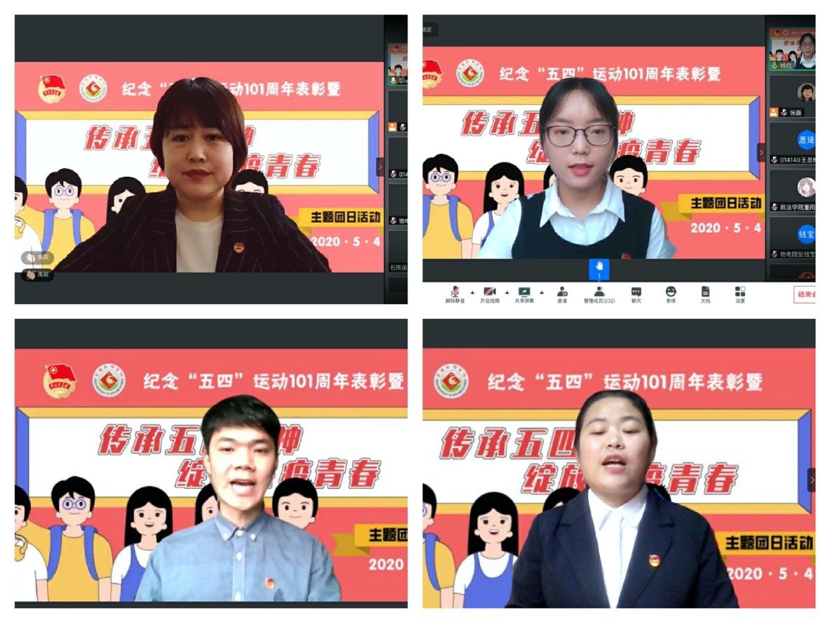 大会表彰了2019年度五四红旗团总支、共青团工作单项奖、五四红旗团支部、十佳学生会、十佳团干部、十佳团员、十大活力团支部书记、优秀团干部、优秀团员和抗击疫情志愿服务活动优秀志愿者等先进集体和先进个人。化学化工学院团总支书记郑雅月,陕西省优秀共青团员获得者、经济管理学院学生杨欢,十佳团干部获得者、抗击疫情志愿服务活动优秀志愿者、计算机学院林钰淏和抗击疫情志愿服务活动优秀志愿者、历史文化与旅游学院李慧代表获奖集体和个人作了线上交流发言。
