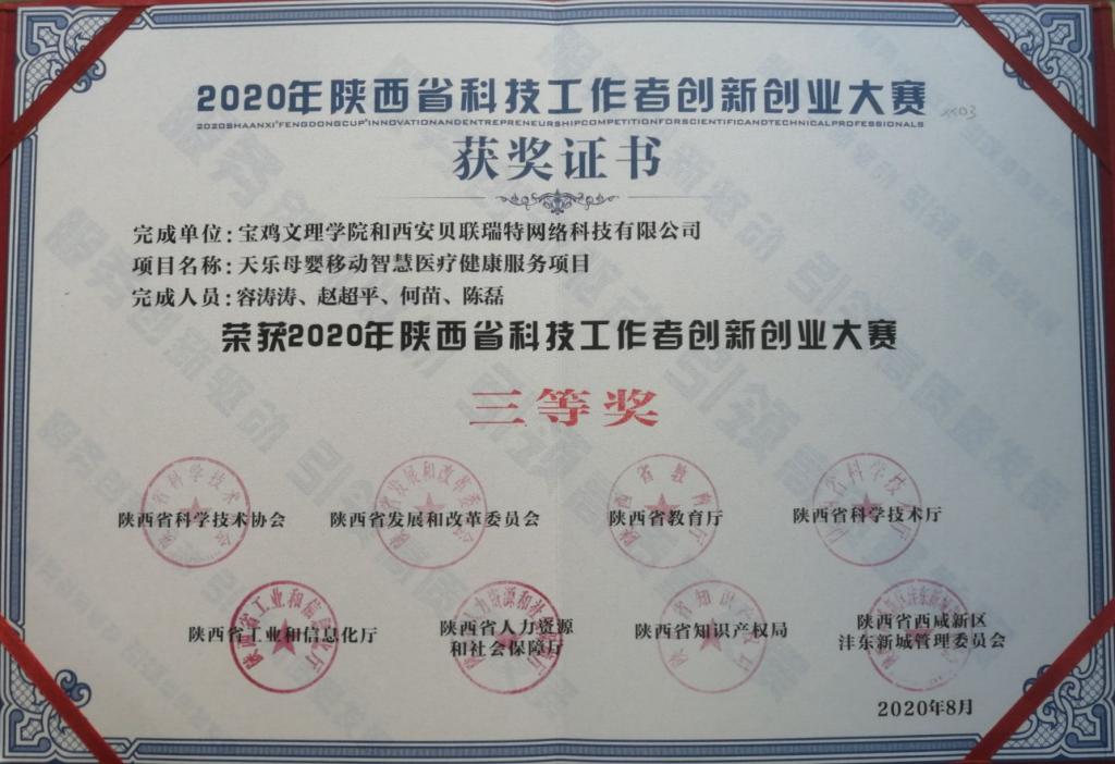 8月25日至27日,2020年“沣东杯”陕西省科技工作者创新创业大赛在西咸新区沣东新城举行,beat365官网物理与光电技术学院教师容涛涛博士的项目《天乐母婴移动智慧医疗健康服务项目》荣获三等奖。
