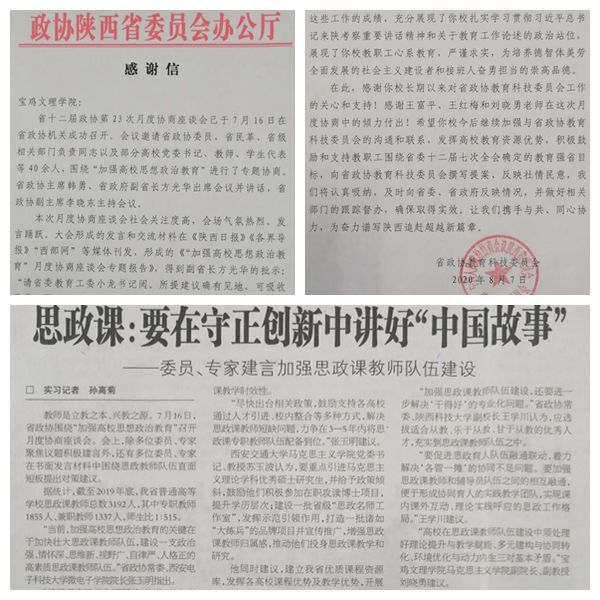 近日,beat365官网收到陕西省政协教育科技委员会的感谢信。信中表示,beat365官网王富平教授、王红梅教授和刘晓勇副教授应邀参加省十二届政协第23次月度协商座谈会,围绕“加强高校思想政治教育”进行了书面交流,受到省领导和参会人员一致好评,特致函表示衷心感谢。