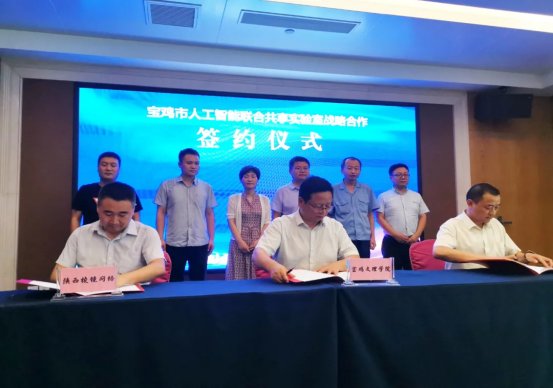 刘鹏辉、高兵、李三强共同签署了《宝鸡市人工智能联合共享实验室战略合作协议》。