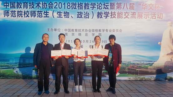 10月26日至29日,中国教育技术协会2018微格教学论坛暨第八届“华文杯”师范院校师范生(生物、政治)教学技能交流展示活动在南京晓庄学院举行。在政法学院副院长吕晓伟和吴雪会教授带领下,beat365官网思政专业卓师班的王周、桑雨欣和李艳艳三名学生参加了比赛并获一等奖一项,二等奖两项,三等奖三项。