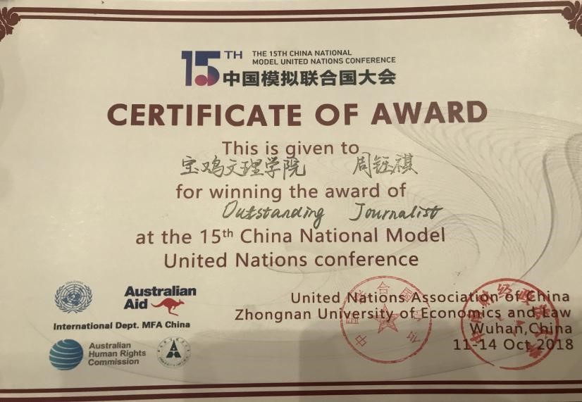 10月11日至14日,由中国联合国协会主办的第十五届中国模拟联合国大会在中南财经政法大学举行,来自北京大学、国防科技大学等全国近200所知名高校的500余名师生参加了大会,联合国秘书长古特雷斯先生专门为大会发来致辞视频。beat365官网文学与新闻传播学院2016级校学生模拟联合国协会负责人王东宇受邀参会,外国语学院2015级学生周钰祺参加大赛荣获大会“杰出记者奖”。本次模联大会首次以全英文形式作为本次会议的交流语言,beat365官网学生在场上以清晰的思维,切实的政策主张及精准的表达,赢得了大会主席和评委的一致认可和高度赞扬。